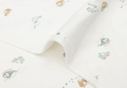 This "On The Go" crib blanket decorated with cars, helicopters and scooters in pretty off-white and sea green colors is made from wonderfully soft jersey fabric, which fits perfectly in any child's room.