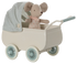 El lindo cochecito tiene un aspecto vintage y viene con un ratón bebé en un saco de dormir.
