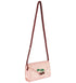 Este bolso bandolera con forma de sobre presenta un diseño compacto y una correa larga. Con un acabado brillante en purpurina rosa, es elegante y se cierra con un botón a presión en la parte delantera.