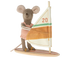 Este pequeño ratón está listo para un día en la playa. Lleva un traje de baño y lleva su tabla de surf, ya que prefiere pasar su tiempo en el mar.
