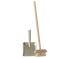 Incluye una pala plateada en tonos cálidos y una escoba de madera, ideales para completar tu casa de muñecas con encanto y funcionalidad.