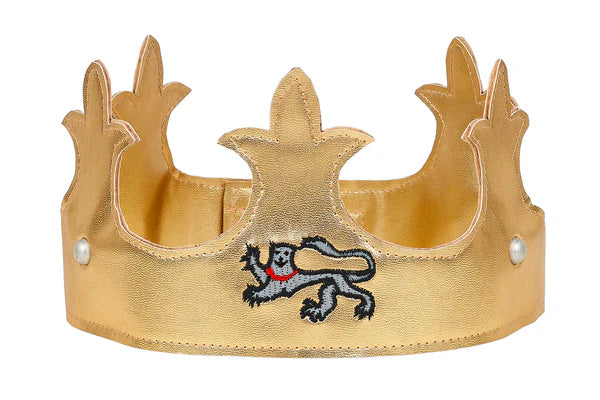 Bonita coroa real dourada com um pequeno brasão bordado na frente.